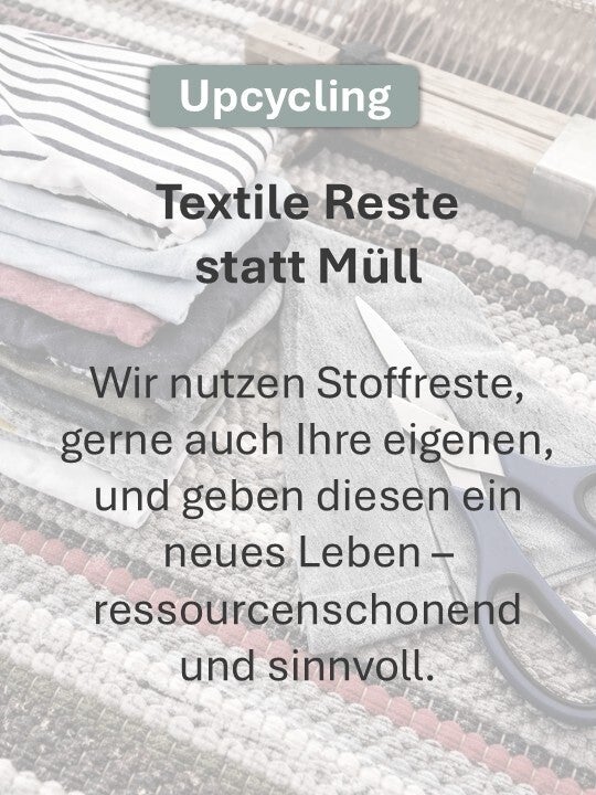 In unserer Handweberei erhalten textile Reststoffe ein neues Leben. Sie wählen die Materialien und das Design – wir fertigen daraus Ihren individuellen Teppich. Gerne verarbeiten wir auch Ihre eigenen Stoffreste, sofern eine technische Umsetzung möglich ist. Jeder Teppich ist ein liebevoll hergestelltes Einzelstück aus regionaler Handarbeit. Da jedes Stück von Hand entsteht, braucht es Zeit – dafür ist nichts von der Stange und jedes Werk ein echtes Unikat, das Charakter und Nachhaltigkeit in Ihr Zuhause bringt.